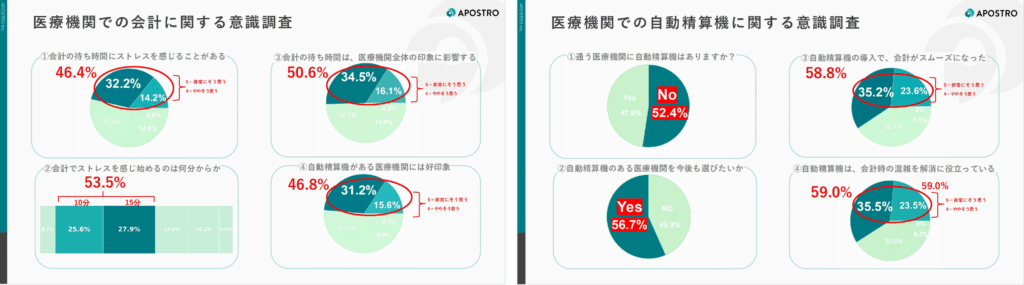 株式会社APOSTROは、全国1,000名を対象に会計の待ち時間や自動精算機の利用実態を調査し、その結果、46.4%が会計待ちでストレスを感じているなど、患者体験に直結する課題が明らかになりました。